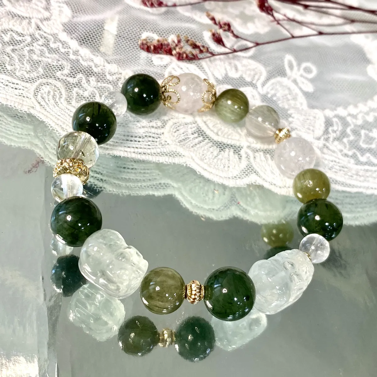 在陽光下閃著淡淡的光,就像沙漠裡的星星,很遠,卻不冷。濃色綠髮晶和透體綠髮晶交錯著,像我這些年走過的路,一段深、一段明亮,一段忘不了的寂寞。