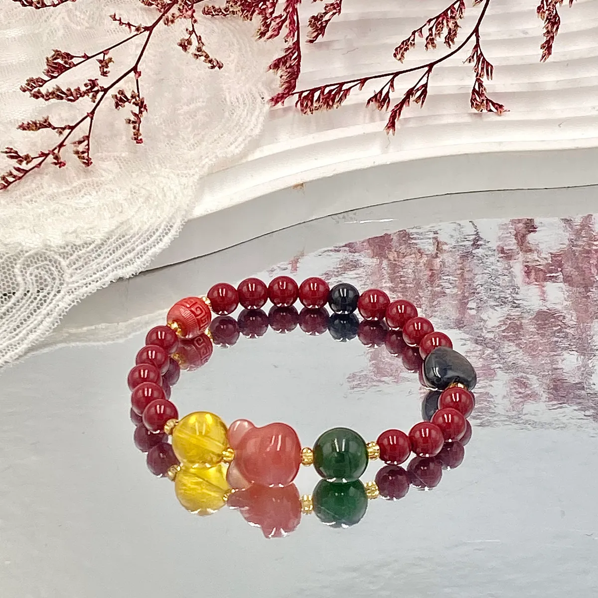 硃砂自古被視為平安吉物在這敏感、情緒易浮動的月份戴上它,為你築起一道防護罩穩定磁場、屏蔽負能量是守護,更是一份心安﹝每一條設計款皆經過精挑細選與能量淨化﹞ 手圍:約 15 cm ( 如需客製手圍大小,請洽客服 )