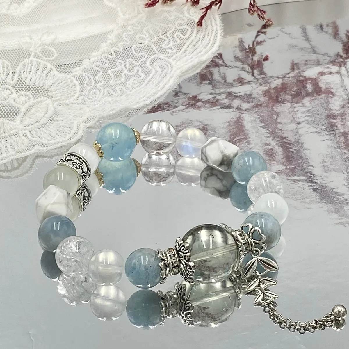 《璃月》是你能量場中的守護聖域,如湖水之下的那層沉靜力量,澄澈、寧和,卻能包容萬象。在這條手鍊中,每一顆水晶都帶著特定頻率,彼此共振,不僅穩定妳的磁場,更啟動內在靈性的源頭。